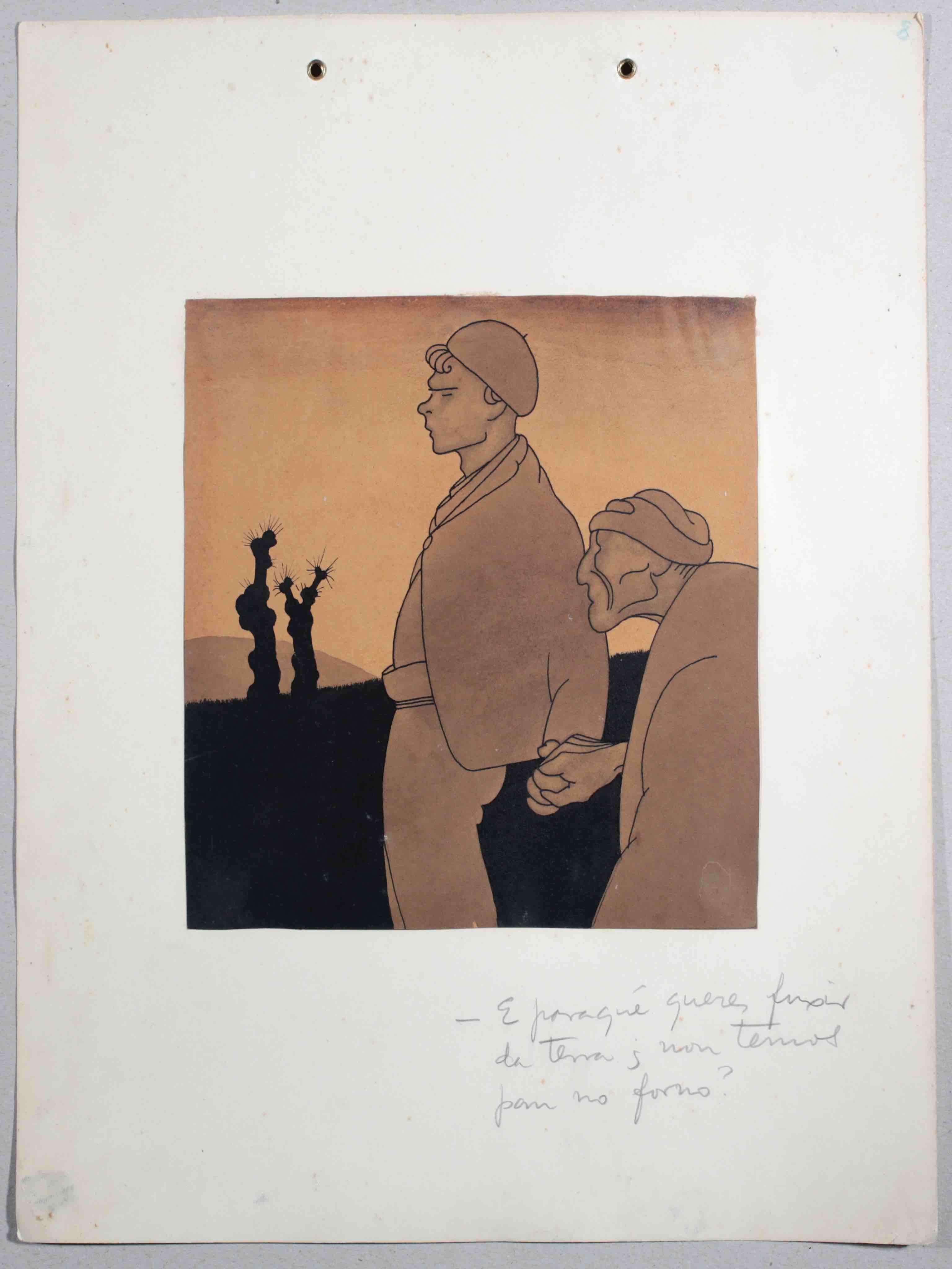 Con este mismo tema y texto similar, Castelao había publicado en 1915 un dibujo en La Voz de Galicia de Buenos Aires y en Labor Gallega de La Habana, y en 1918 otro en el diario madrileño El Sol. El Museo de Pontevedra custodia un dibujo con los mismos personajes que los protagonizan, posiblemente sea el precedente de todos ellos.
